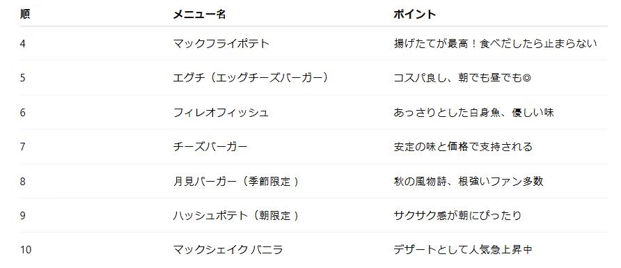 1位の「てりやきマックバーガー」は不動の人気を誇り、続くチキンフィレオ、ビッグマックも安定の支持を集めています。さらに季節限定メニューや裏ワザ注文など、マックの楽しみ方は無限大 です。